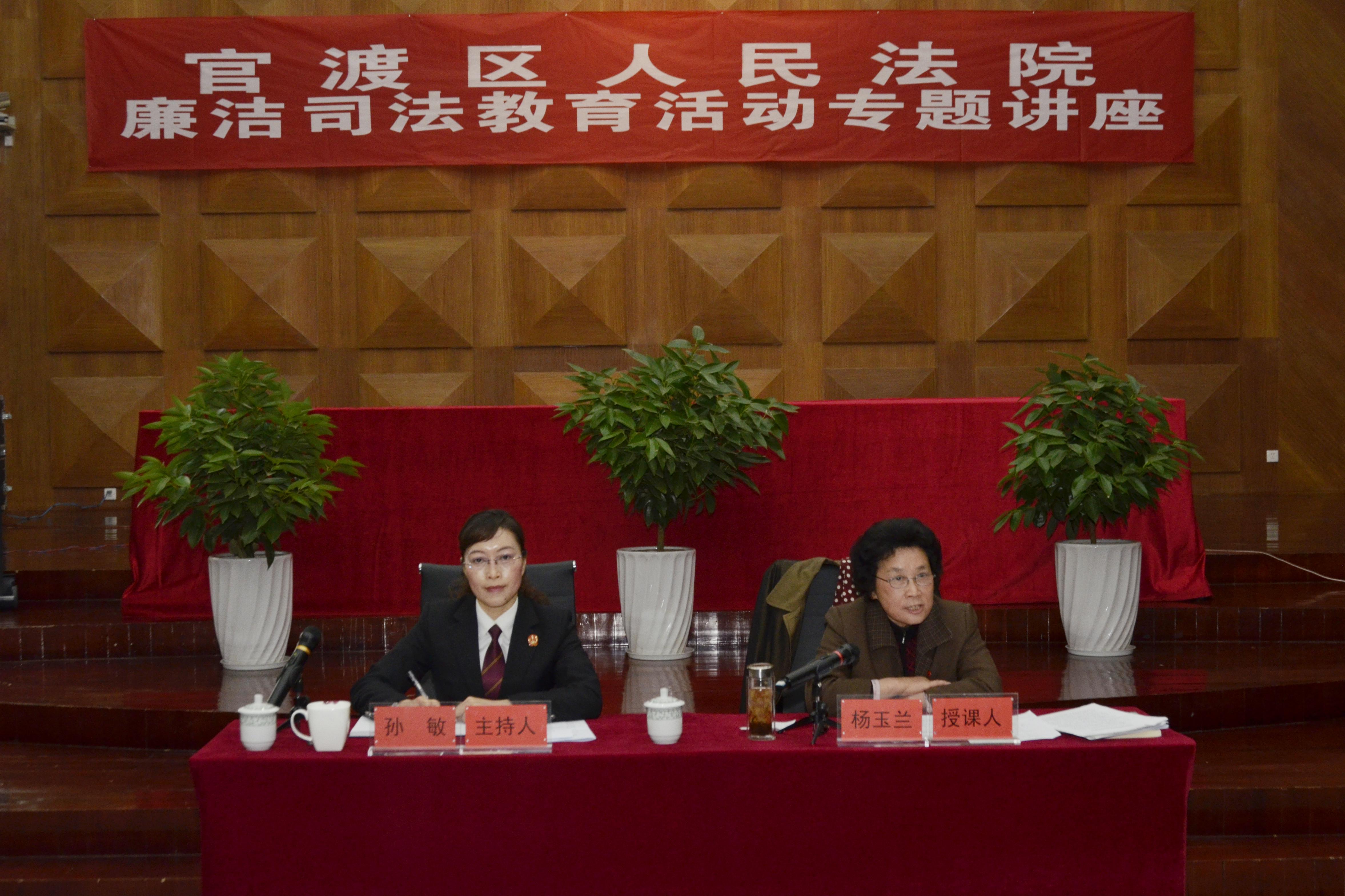 为进一步加强法院队伍建设,转变工作作风,提高官渡区法院党风廉政建设水平,根据上级法院的有关文件要求,经区法院院党组研究决定,在今年1至3月对全院干警集中开展廉洁司法教育活动。按照区法院院《关于集中开展廉洁司法教育活动的实施方案》安排,2014年2月14日上午,专门邀请了原中共云南省委巡视组组长、原昆明市中级人民法院院长杨玉兰同志为全院干警作了一场以“不受、不污,廉洁司法”为主题的廉政文化专题讲座。区政协副主席李政章、区人大内司委主任陈海娟、区政协社法委主任李静玲、区纪委第五纪工委副书记虞自力等领导应邀参会。