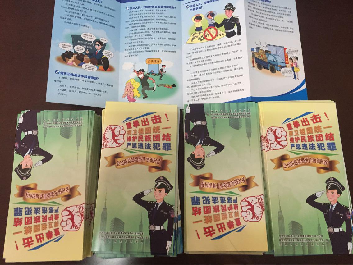 本次反恐安全防范知识宣传活动中采取了放置宣传展板、开辟社区宣传栏目、向单位、社区居民发放《反恐宣传册》,讲解常见的恐怖袭击手段、涉恐人员的可疑迹象、外在表现及应对恐怖活动的方法,活动中共计摆放法律宣传展板10余块,发放《反恐宣传册》300余份。此次活动增强了群众反恐识恐及报警意识,提高了群众防范恐怖袭击和自救互救能力。